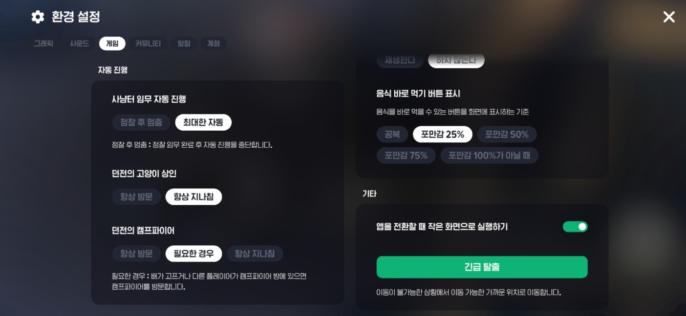 가끔 설정을 확인 안 하는 유저들이 있다. 그러지 말고, 이 부분은 꼭 확인하자. 특히 기술 사용 관련은 클래스마다 자동사냥 효율 높은 것이 정해져 있으니, 그에 맞추면 좋다.