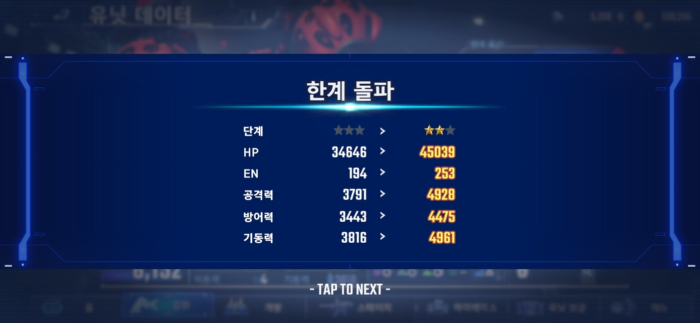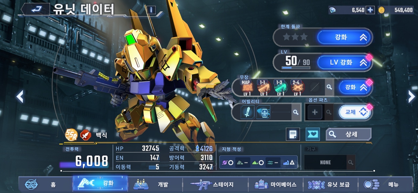 초반에는 기체 강화 아이템 효율이 매우 좋기 때문에 조금만 사용해도 해당 레벨에는 금방 도달한다. 게임이 어려워진다 싶으면 자원을 아끼지 말고 투자하자. 특히 건담ZZ 스토리에서도 사용할 수 있는 제타건담과 백식에는 미리 자원을 투자하는 것도 좋다.