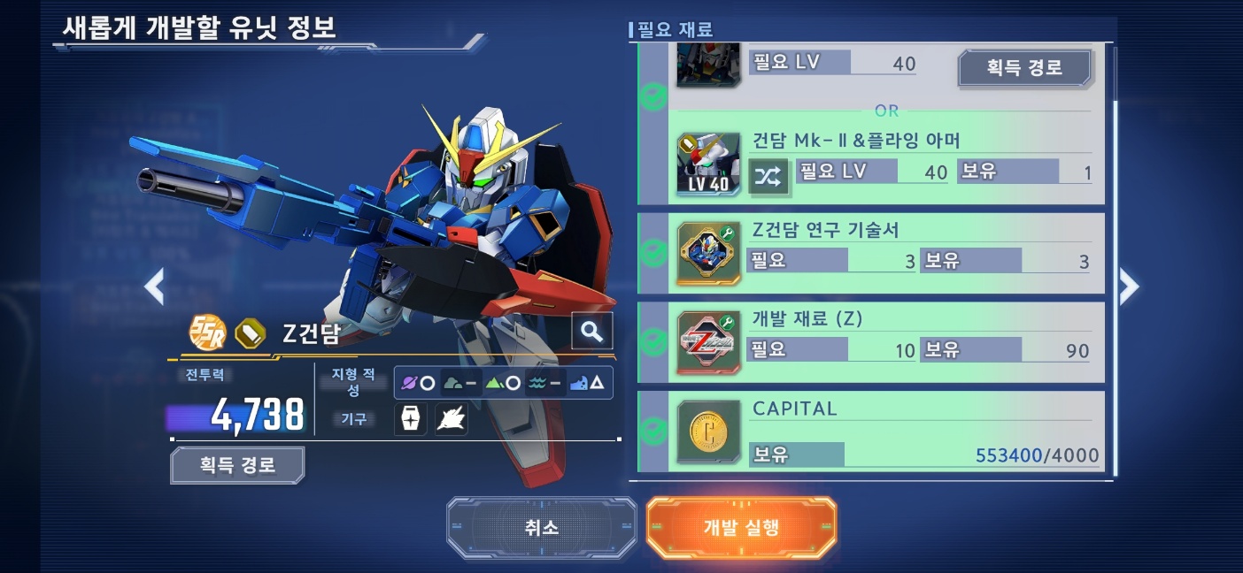 개발을 통해 입수할 수 있는 SSR 기체는 뽑기를 통해 얻는 UR 기체에 비할 정도는 아니지만, 게임 진행에 매우 큰 도움이 된다. 무조건 최고만 육성하겠다는 유저가 아니라면 SSR에 대한 투자는 아끼지 않는 것이 좋다.