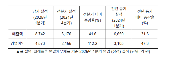 크래프톤은 한국채택국제회계기준(K-IFRS)을 적용한 연결 재무제표를 기준으로 2025년 1분기 매출액 8,742억 원, 영업이익 4,573억 원을 기록하며 역대 최대의 분기 실적을 달성했다. 지난해 같은 기간과 비교해 매출과 영업이익이 각각 31.3%, 47.3% 증가한 수치로, 또 한 번 분기 사상 최고치를 경신했다.