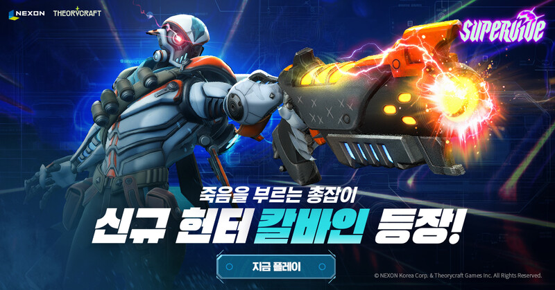 넥슨은 30일 띠어리크래프트 게임즈에서 개발한 신작 MOBA 배틀로얄 PC 게임 '슈퍼바이브(SUPERVIVE)'에 신규 헌터(캐릭터) '칼바인'을 공개했다.