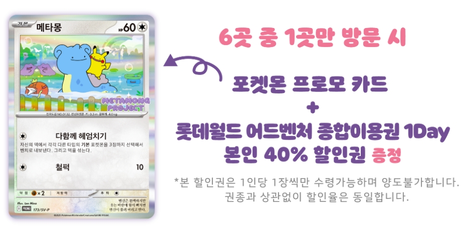 이 카드는 석촌호수에 있는 메타몽 인형을 그대로 그림으로 옮겼다. 게임에서 사용하기 좋은 편은 아니다. 완벽한 상위 호환 카드도 있기에 더욱 그렇다. 하지만, 반짝이고 귀여운 일러스트, 한국에서만 구할 수 있다는 희소성 때문에 카드 수집가들 사이에서 매우 높은 가치가 형성된 상황이다. 이에 해당 카드를 얻기 위해 국내에 방문한 외국인 관광객도 제법 많다는 관계자의 언급이 있었다.