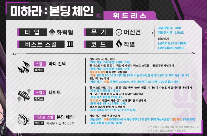 자가 버프가 전혀 없다는 것은, 반대로 말하면 다른 니케들이 주는 버프가 완전한 효율로 들어온다는 의미다. 미하라에 어울리는 서포팅형 파티원이 새로 등장해 지속 대미지 조합을 만들 수 있다면 메타를 완전히 바꿀 수도 있는 주인공이다.