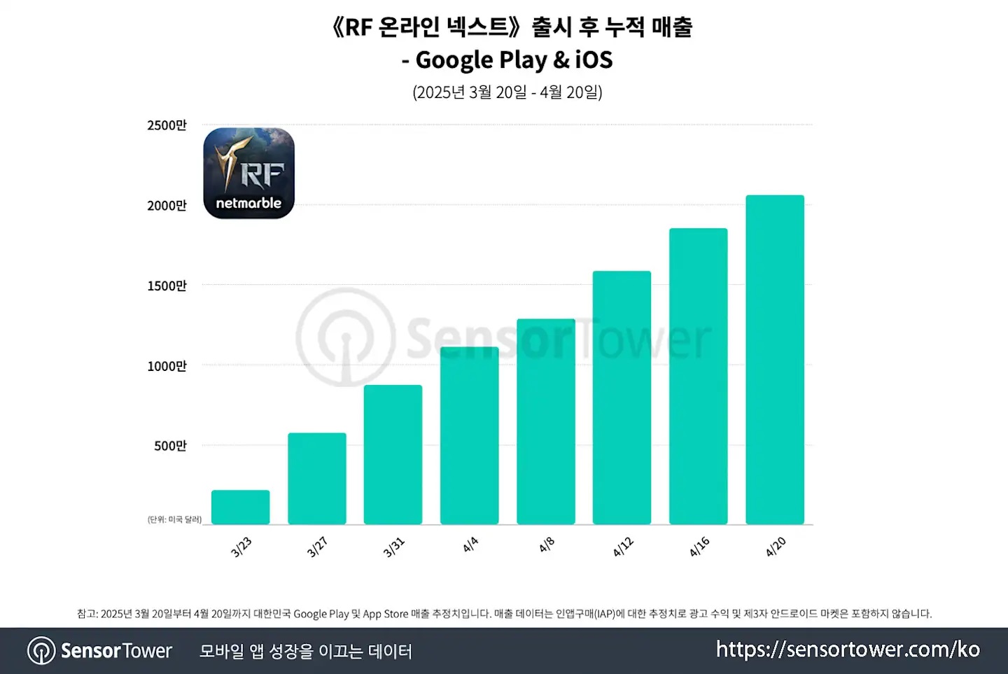 글로벌 모바일 시장 조사 업체 센서타워는 넷마블에서 출시한 'RF온라인 넥스트'이 출시 한 달 만에 2천만 달러의 매출을 올렸다고 밝혔다. 해당 매출은 모바일 플랫폼인 구글 플레이스토어와 애플 앱스토어의 통합 추정치를 기준으로 한다.