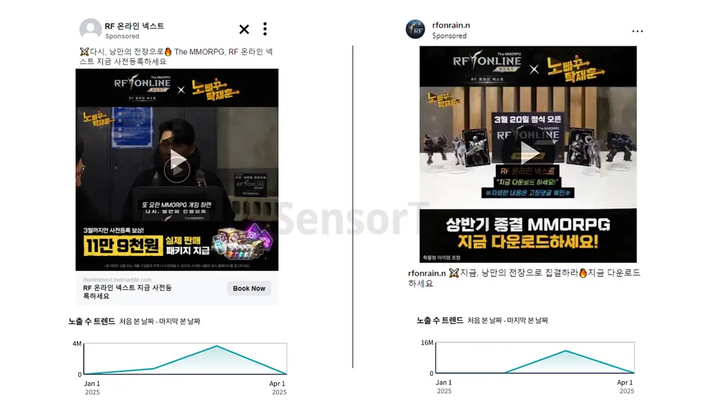 이에 더해 출시 전후 마케팅의 일환으로 RF온라인 IP를 배경으로 하는 웹툰과 웹소설을 선보였고, 유튜브 등 메타 플랫폼에 디지털 광고 집행이 크게 늘은 것도 유효했을 것으로 짐작했다. 센서타워 자료에 따르면 한국 시장의 인스타그램, 페이스북에 넷마블 게임의 노출 수가 8배 이상 증가했다.