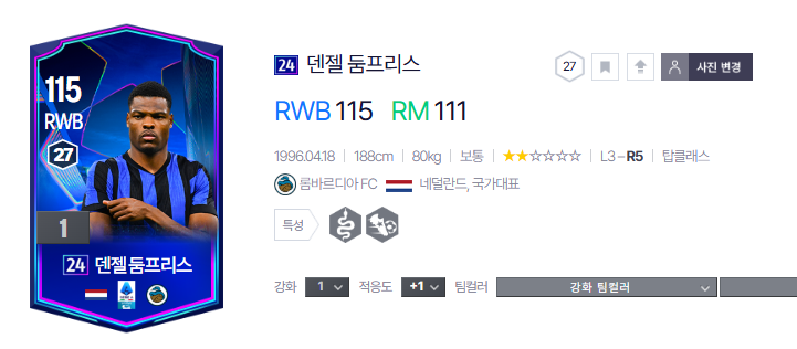 인테르의 승리에 가장 크게 기여한 선수는 1차전에서 2골 1도움, 2차전에서 2도움을 기록한 ‘덴젤 둠프리스’다. 모든 매체에서 이견 없이 팀 내 최고 평점을 부여하며 압도적인 활약을 인정했다. 이에 덴젤 둠프리스의 ‘24UCL’ 클래스 또한 최대치의 능력치 상승이 이루어질 것으로 예상된다. 24UCL 덴젤 둠프리스의 능력치 상승 상한은 3이다.