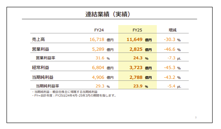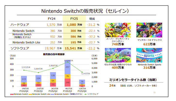 닌텐도는 8일 2025년 3월기 연결 결산으로 매출액 1조 1649억 엔, 영업이익 2825억 엔, 최종이익 2788억 엔을 발표했다. 전년기 대비 각각 약 30%, 46%, 43% 감소했다.