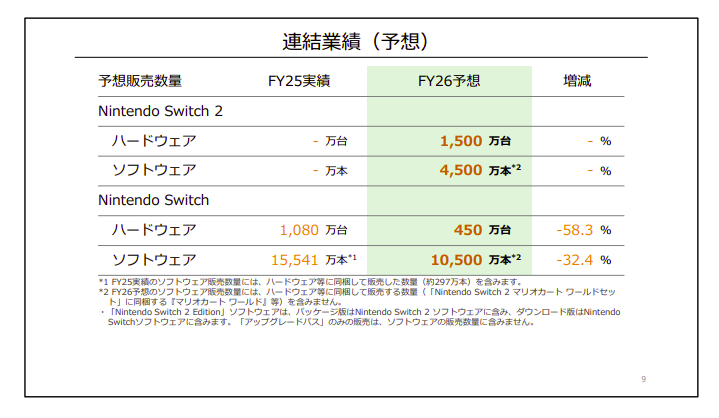실제 닌텐도는 내년 3월까지 스위치2 소프트는 4,500만 장 판매를 예상했지만, 스위치 소프트는 1억 500만 장으로 발표했다. 이를 통해 내년 3월까지는 스위치2 전용 소프트보다는 스위치 소프트 출시에 전념할 것을 예상할 수 있다. 이에 닌텐도에서 출시하는 게임을 스위치2로 본격적으로 즐기는 것은 내년 3월 이후가 될 전망이다.
