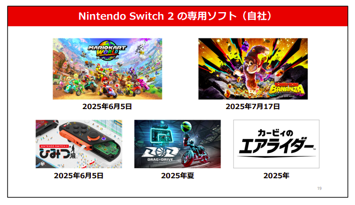또한, 연내 자사 소프트의 추가 개발에 대해서는 언급하지 않았다. 닌텐도는 올해 스위치2에서 즐길 수 있는 게임이 '마리오 카트 월드', '동키콩 바난자', DRAG x DRIVE', '커비의 에어라이드'라고 밝혔다. 또한, 스위치2 에디션도 기존에 발표한 6작품에서 추가하지 않았다. 스위치2 판매량 예상치를 소극적으로 잡은 것도 이에 대한 연장선이라는 반응도 있다.