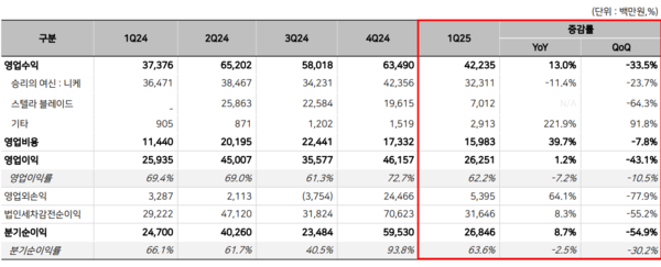 시프트업은 12일, 자사 IR 페이지를 통해 2025년 1분기 실적자료를 공개했다. 영업수익(매출)은 422억원, 영업이익은 263억원, 순이익은 269억원이다. 전년 동기 대비 매출은 13% 상승했다. 단 비용 증가로 인해 영업익은 1.2% 늘었다.