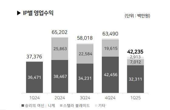 대표 게임은 여전히 '승리의 여신: 니케'로, 분기 매출 323억원을 기록했다. '니케'는 항상 1분기에 큰 이벤트가 없어 가장 낮은 성적을 거뒀다. 전년 1분기에 비해서는 매출 11%가 감소했다. 하지만 '스텔라 블레이드'가 매출을 보완하면서 실적 상승을 견인했다.