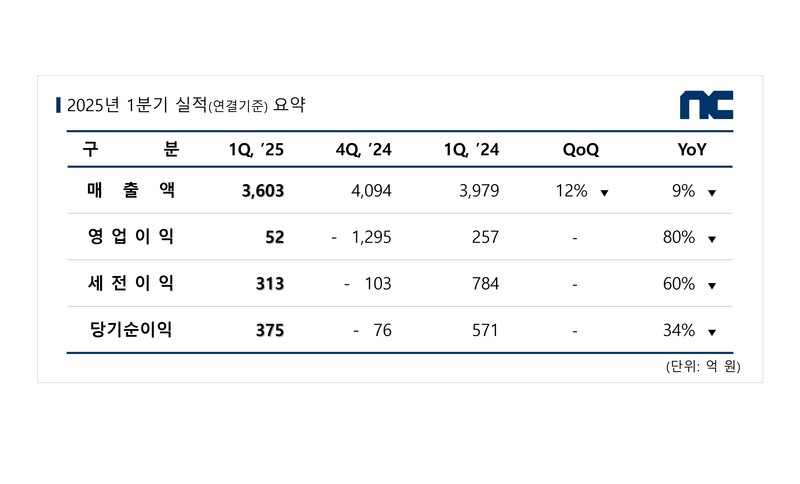 엔씨소프트가 2025년 1분기 실적 결산(연결기준) 결과 매출 3,603억 원, 영업이익 52억 원, 당기순이익 375억 원을 기록했다고 밝혔다.