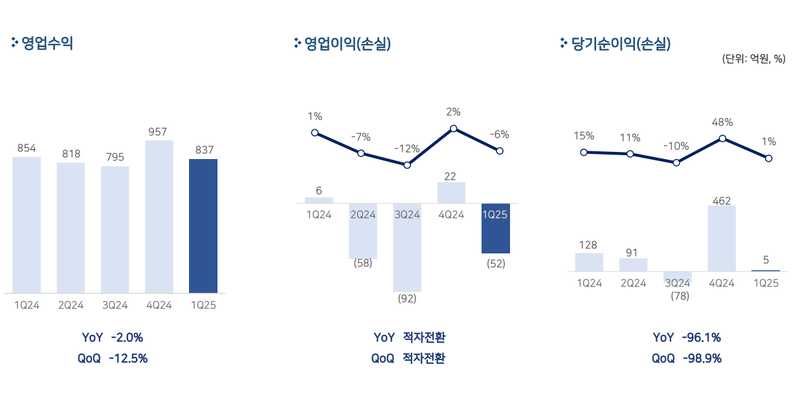 한편 펄어비스는 2025년 연결 기준 1분기 매출 837억원, 영업손실 52억원, 당기순이익 5억원을 기록했다. 전체 매출의 80%는 해외에서 발생했으며, 영업이익은 CCP게임즈의 신작 개발 비용 증가로 인해 적자 전환했다.
