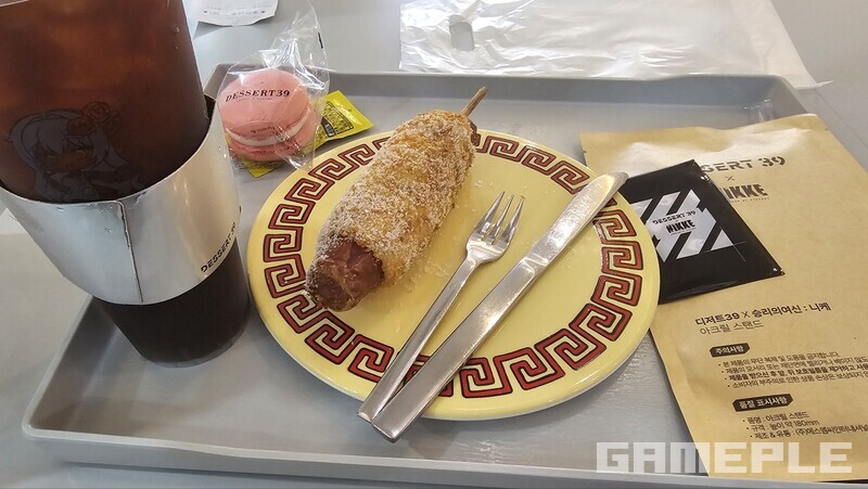 그중 2주차에 새로 추가된 다섯 번째 메뉴를 주문했다. 니케 보급 상자 세트는 약간 저렴한 22,200원이다. 음료는 아메리카노와 제로 칼로리 복숭아 아이스티 중 선택, 디저트로 찹쌀 핫도그와 마카롱 1개씩이 포함됐다. 카페인 부담이나 유당불내증으로 고생하는 유저들의 의견을 받아들여 배려한 흔적이다.