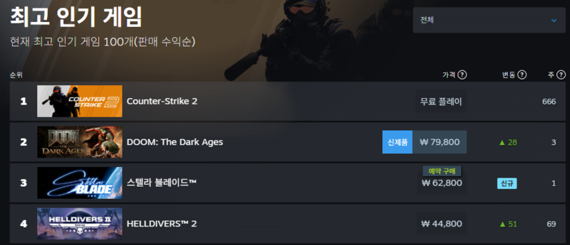 1위는 꾸준히 글로벌 인기를 유지 중인 ‘카운터 스트라이크2’, 2위는 15일 출시한 신작 ‘둠: 더 다크 에이지스’가 차지했다. 3위 스텔라 블레이드 다음으로는 ‘헬다이버즈2’가 4위에 자리 잡고 있어, 슈터 장르 사이에서 고군분투하는 모습이 연출됐다.