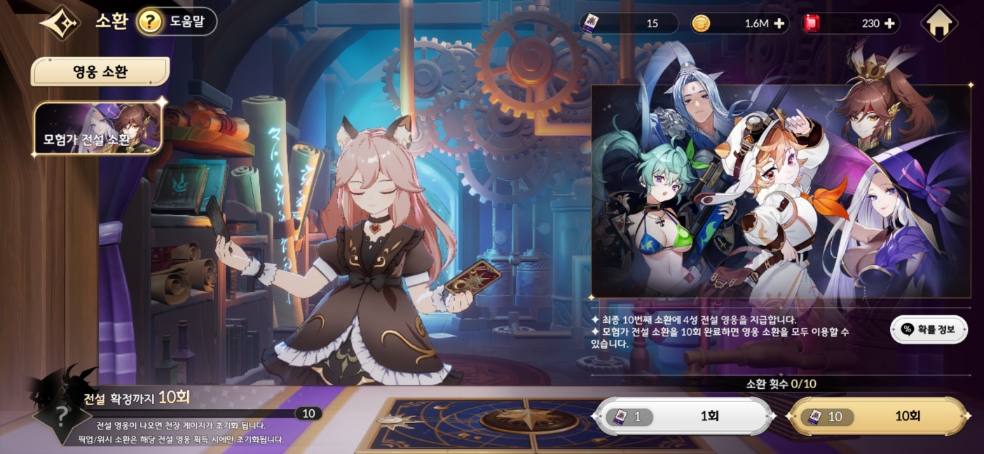 조금 더 많은 뽑기에 도전하고 싶다면 전설 확정 10연 결과를 무시하고 1-20까지 클리어하고 모이는 루비로 픽업 뽑기에 도전할 수 있다. 이 시점에서 모을 수 있는 루비를 싹 긁어 모으면 1000개다. 이를 통해 픽업뽑기 10회에 도전할 수 있다. 루비로 뽑을 수 있는 픽업 캐릭터는 제이브가 가장 좋다.