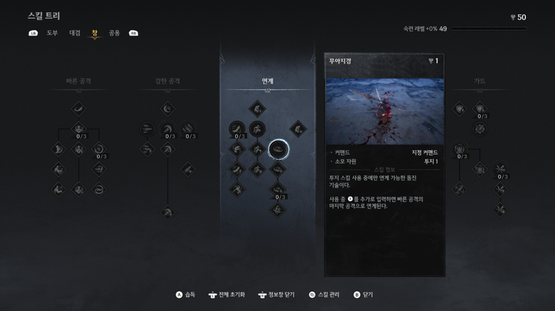 각종 유저 커뮤니티에서 1회차 기준으로는 창이 가장 효율적인 무기 선택지로 평가받고 있다. 긴 공격 범위와 빠른 공격 속도, 쉬운 스킬 연계 덕분에 기본 스펙이 부족한 1회차에서도 안정적인 공격과 생존을 모두 확보할 수 있다. 특히 ‘무아지경’의 마지막 34레벨 연계 스킬을 습득하면 기본 공격과 스킬 ’무아지경’을 반복해서 가하는, 단순하면서도 효율적인 콤보 덕분에 숙련도가 낮은 유저라도 가장 빠르게 클리어할 수 있는 무기로 꼽힌다.