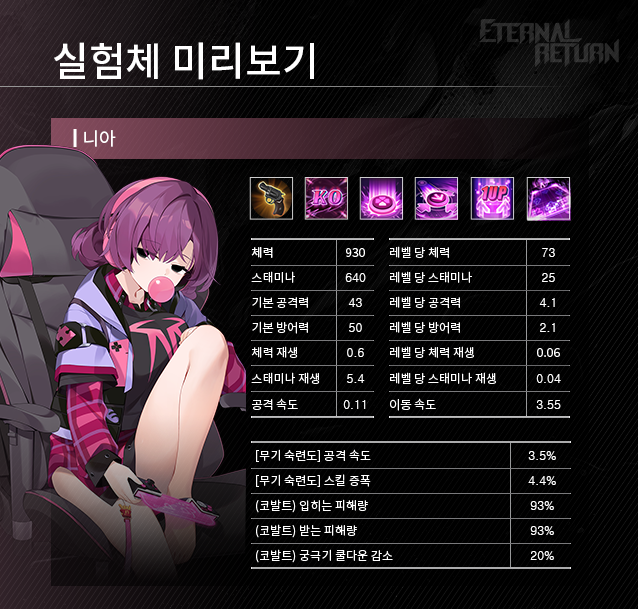 넵튠 자회사 님블뉴런의 대표작 '이터널 리턴'은 지난 15일 1.47 패치를 통해 실험체 니아와 함께 뒷골목 히스이 희귀 스킨 추가, 기존 실험체 밸런스 조정을 진행했다. 니아는 5월 20일부터 랭크 게임에 합류한다.