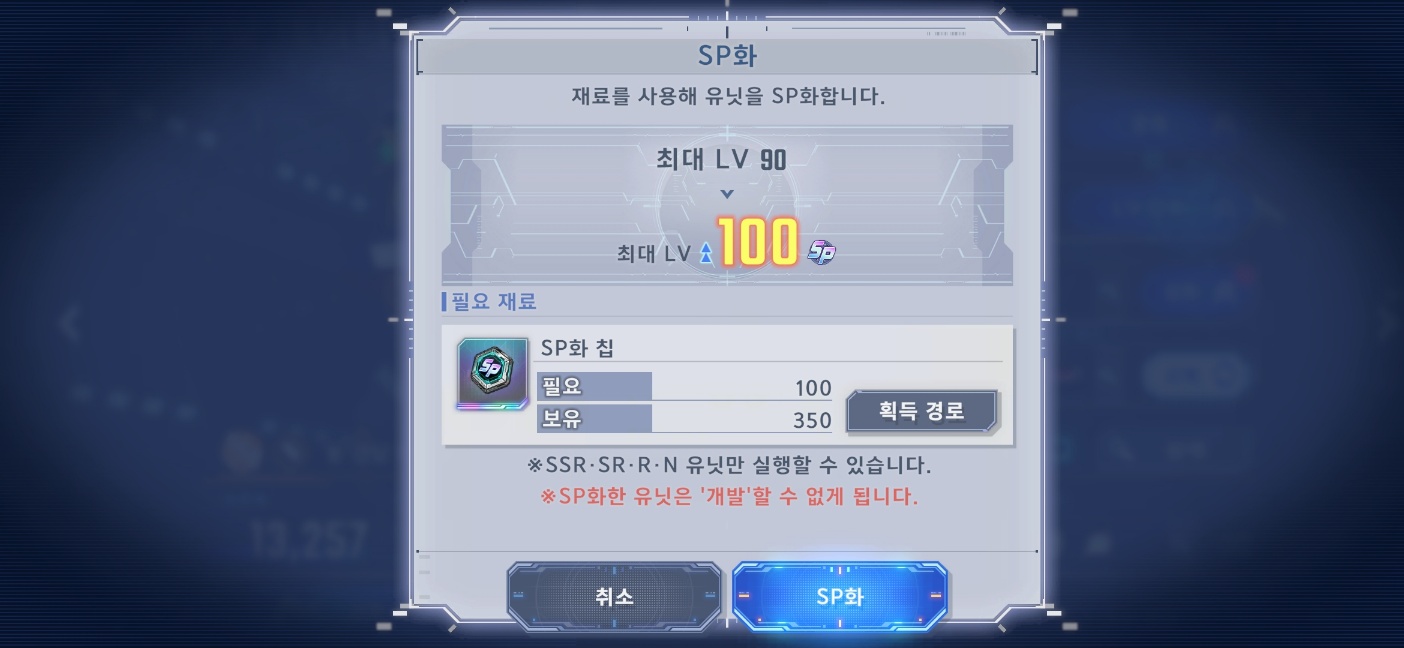그런 만큼 좋아하는 기체를 활용할 수 있고, 어려운 스테이지를 클리어하는 데 요긴하게 사용할 수 있는 시스템이다. 다만 지금까지는 SP화에 필요한 재화 입수가 힘들어서 신중히 사용해야 했다.