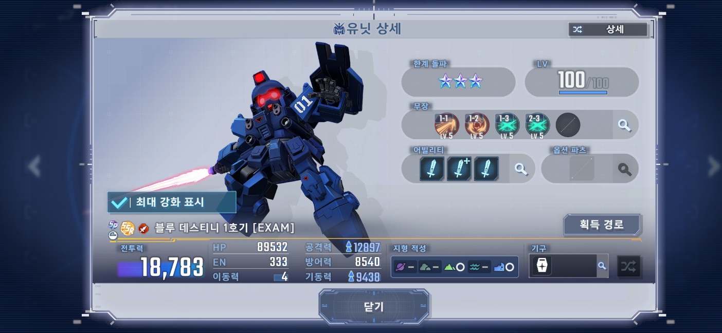 반대로 이를 만족하지 못하면 성능과 관계 없이 그냥 따라갈 수 없다. 실제 SSR '블루 데스티니 1호기'의 경우 공격력만은 등급 톱 클래스지만, 이동력, 사정거리, 지형 적응이 모두 안 좋아서 효율이 낮다.