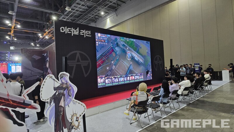 한쪽에서는 거대한 스크린을 띄워서 유저들의 플레이를 중계하고 있다. 이곳에서는 지친 관람객들이 앉아 휴식을 취하면서 유저들의 경기를 볼 수 있다. 한쪽에서는 아나운서들이 마치 실제 e스포츠 경기처럼 실감 나는 해설을 하면서 분위기를 띄우고 있었다.