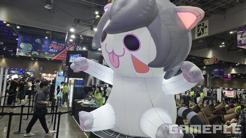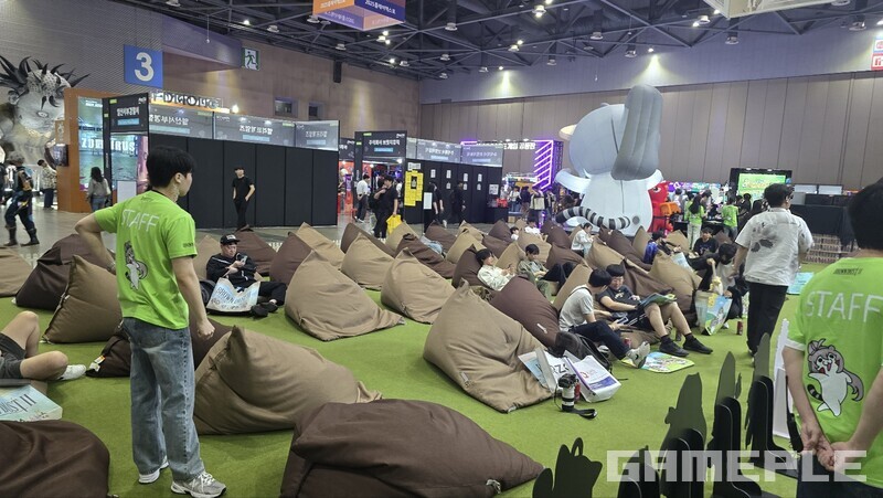 먼저, '브라운더스트2' 부스가 관람객들의 눈길을 끈다. 윾돌이 거대 풍선의 존재감이 압도적이다. 브라운더스트2 유저라면 휴식할 수 있는 라운지가 준비돼 있다. 행사를 관람하다가 지치면 '누워서' 쉴 수 있는 공간으로, 벽넘어 바쁘게 움직이는 관람객들의 부러운 시선을 독차지하고 있다.