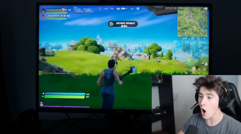 영상 속 남자가 캠을 켠 채 '포트나이트'를 플레이하고 있다. 적을 찾아 달려가는 도중 앞선 팀원이 마지막 처치에 성공하고, 최종 승리를 따내자 팀원과 함께 환호성을 지른다. 두 손을 번쩍 들며 "우리가 빅토리 로얄을 먹었어!"라고 외치기도 한다.