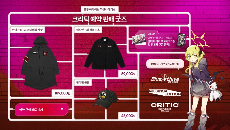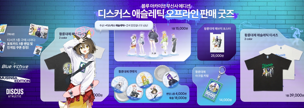 넥슨은 자사에서 서비스 중인 '블루 아카이브'와 무신사 콜라보를 실시한다고 밝혔다. 무신사 입점 브랜드인 ‘크리틱’과 ‘디스커스 애슬레틱’에서 모자와 옷 등 만마전과 황륜대제를 모티브로 제작했다.