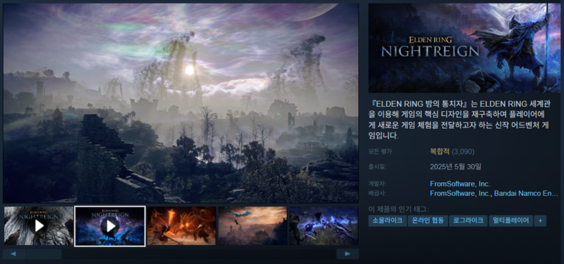 ‘엘든 링: 밤의 통치자’의 스팀 유저 평가는 극명하게 갈렸다. 스팀에서는 현재 2025년 5월 30일 오후 12시 기준으로 총 3,090건의 유저 리뷰 중 약 64%가 긍정적 평가를 남기며 ‘복합적’ 평가를 받고 있다.