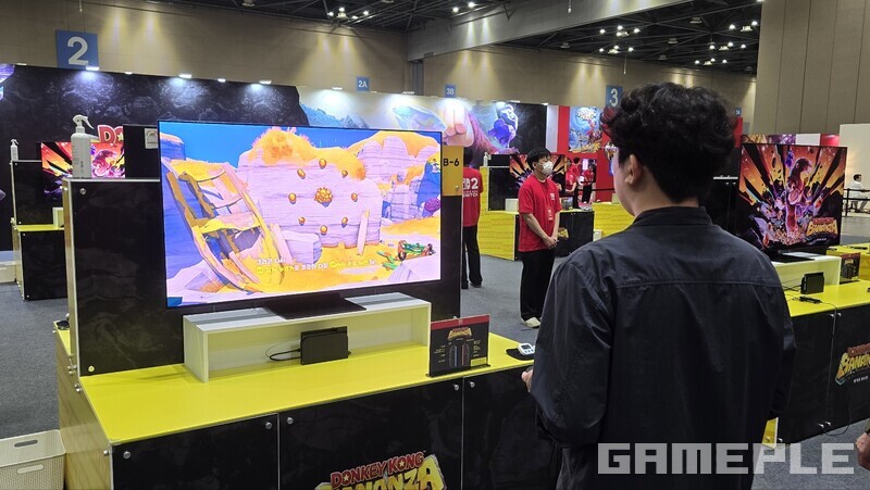 다음으로는 눈에 띄는 것은 '동키콩 바난자'다. 마리오 카트 월드를 제외하고 가장 많은 시연대가 준비됐다. 동키콩 바난자는 그간 홍보영상으로 봐왔던 것보다 더 흥겨운 게임이다. 눈에 보이는것 대부분을 파괴할 수 있다. 다만, 필요 이상으로 파괴하고 다니면 약간의 프레임 드랍이 보여 한층 더 좋아진 스위치2의 성능이 아쉬운 느낌도 든다.