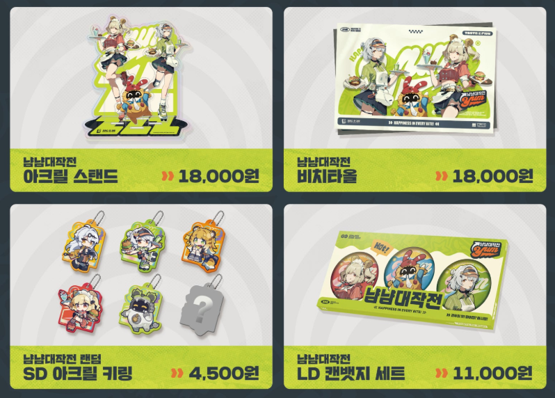 한편, 전국 13개 콜라보 굿즈 매장에서는 냠냠대작전 한정 굿즈를 만나볼 수 있다. 구매할 수 있는 냠냠대작전 굿즈는 아크릴 스탠드, 비치타올, SD 아크릴 키링, LD 캔뱃지 세트로 총 4종이다. SD 아크릴 키링은 의현, 엔비, 귤복복, 버니스 등 다양한 젠레스 존 캐릭터 중 랜덤이며, 나머지 3개의 굿즈에는 엔비, 버니스, 바삭부가 모두 등장한다.