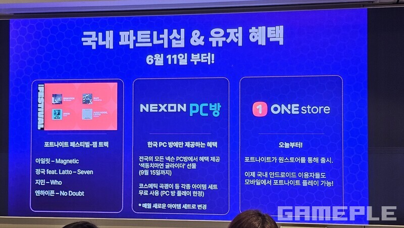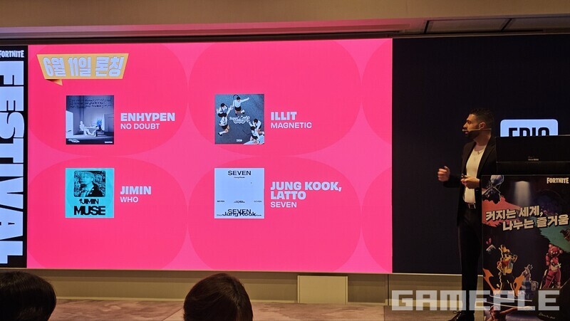 포트나이트 내에 아일릿 'Magnetic', 정국 'SEVEN', 지민 'WHO', 엔하이픈 'NO DOUBT'까지 한국 인기 아티스트의 4개 잼 트랙을 추가한다. 또한 오늘(11일) 포트나이트 모바일을 원스토어에 출시해 유의미한 플랫폼 확장이 시작된다.