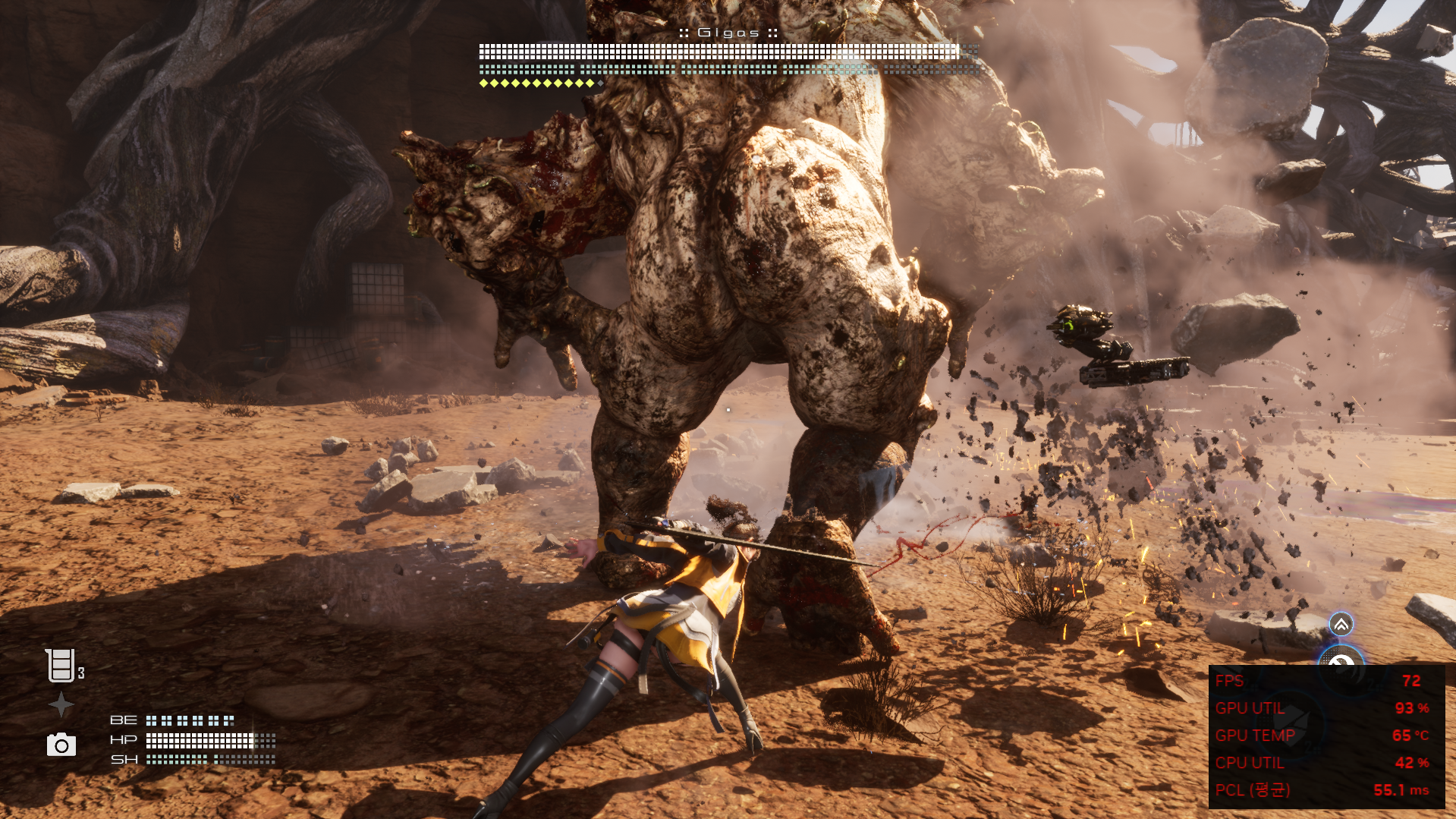 먼저 성능부터 이야기하자면, ‘스텔라 블레이드’ PC판의 최적화는 상당히 만족스러운 수준이다. RTX 3060 그래픽카드 사양 PC로 직접 플레이해 본 결과, ‘매우 높음’ 그래픽 프리셋에서 프레임 제한 없이 전투를 진행했을 때 70~80대 FPS를 유지했으며, 70FPS 밑으로 내려간 적은 없었다.