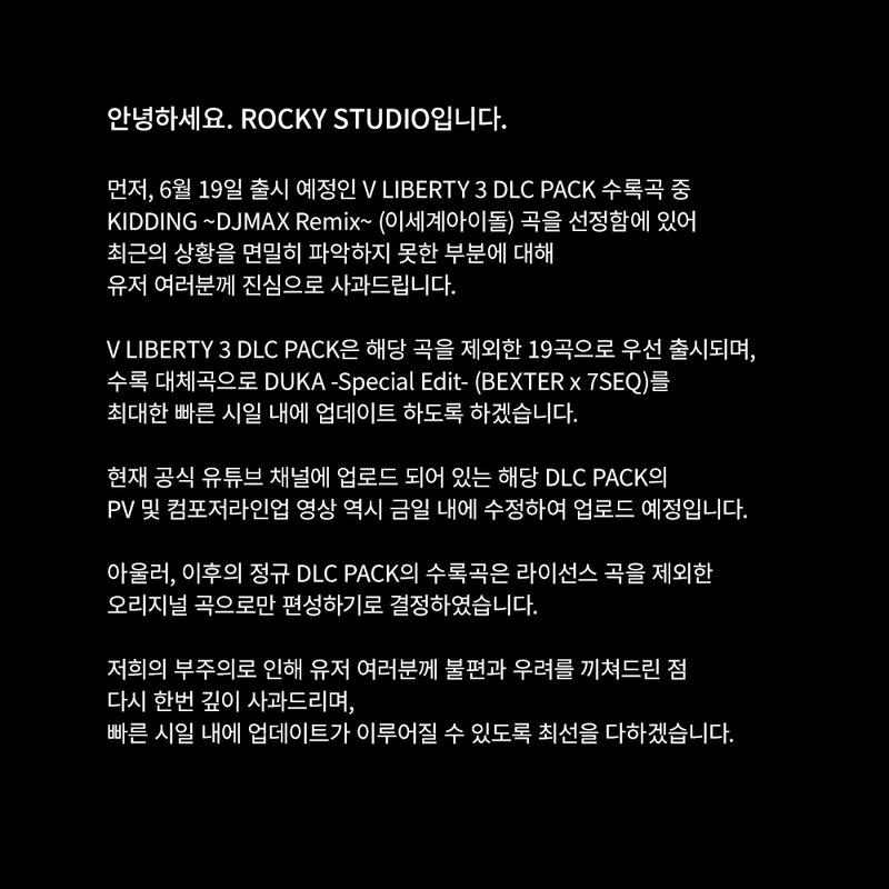 공지에 따르면 이세계 아이돌의 'KIDDING ~DJMAX Remix~'는 DLC 수록에서 제외된다. V 리버티3는 우선 정해진 일정대로 출시하되 나머지 19곡으로 구성되며, 수록 대체곡으로 'DUKA -Special Edit-'(BEXTER X 7SEQ)를 빠른 시일 내 업데이트할 예정이다.