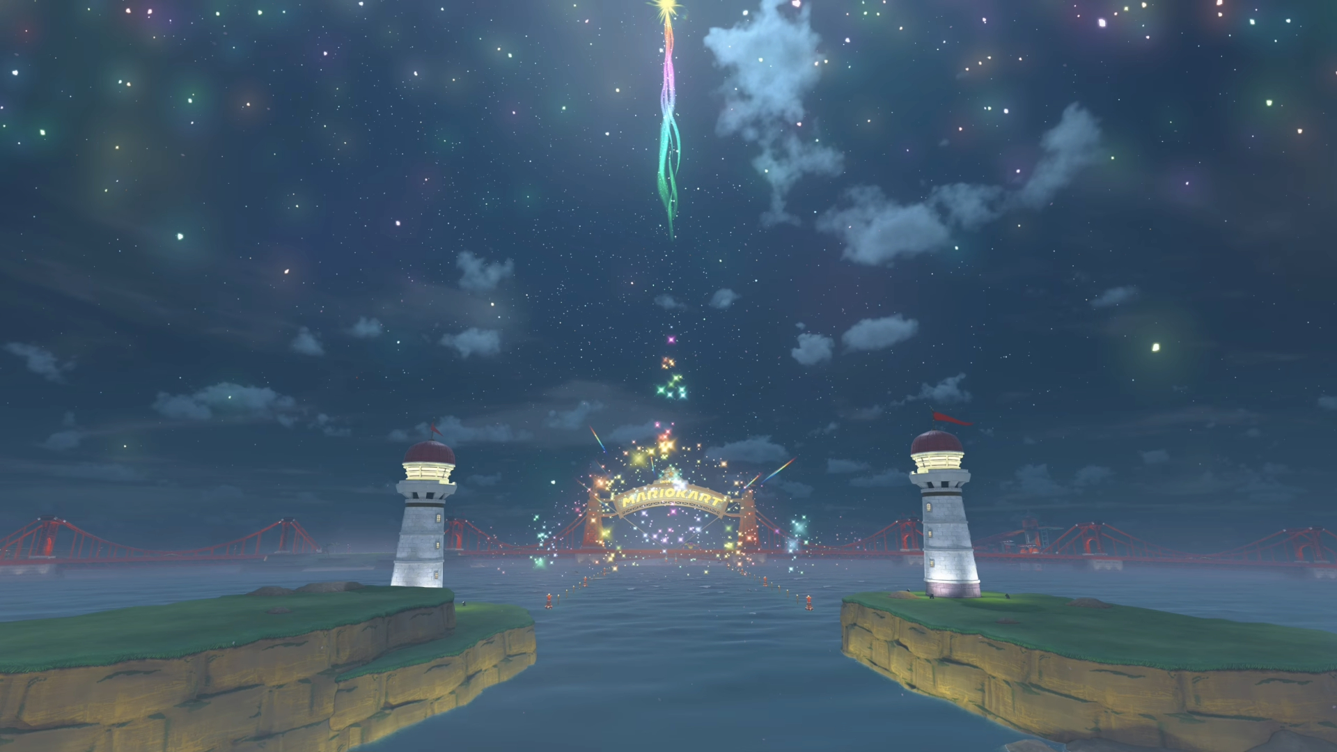 또한 하드웨어 성능에 맞춰 관중의 수가 크게 늘어났고 배경이 더욱 화려해져 눈을 즐겁게 한다. 특히 시리즈 전통의 마지막 코스인 무지개 로드의 퀄리티는 스위치2 구매를 만족하게 하는 레벨이다.