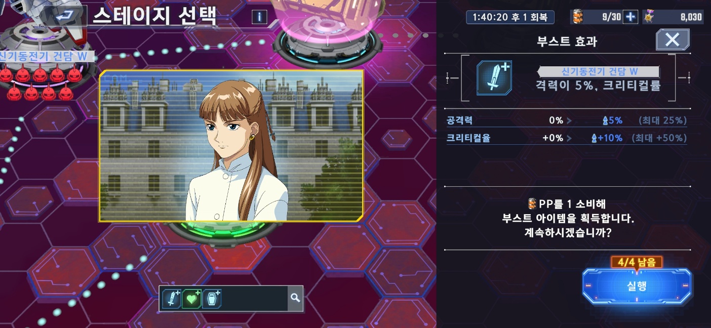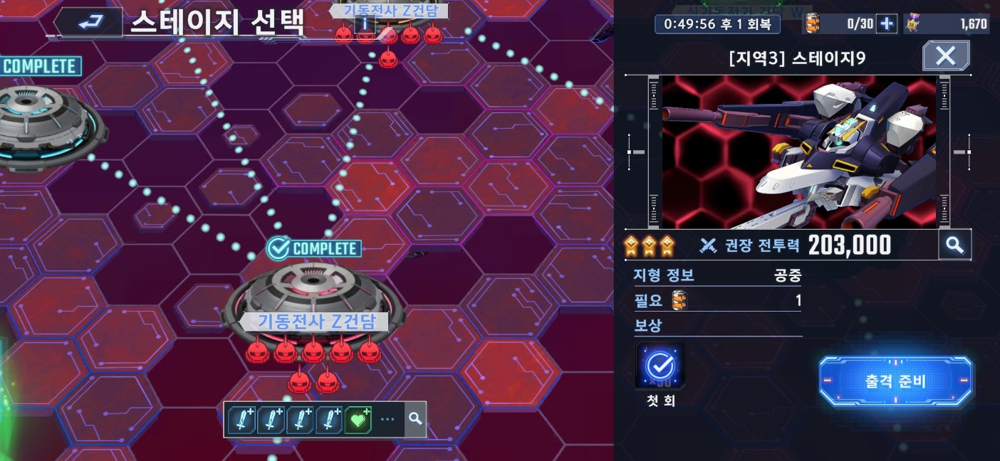 초반 맵은 어렵지 않지만 지역3은 만만치 않다. 어디선가 막힌다면 다른곳에서 최대한 필요 버프를 모아서 다시 도전하던가 추가 육성을 해야 한다. 맵 이벤트를 진행함과 동시에 일반 미션의 Z건담과 건담W에서 육성 지원 이벤트가 진행된다. 이 기회에 이 두 작품의 개발 SSR들을 최대한 제작해 보는 것도 좋을 것이다.