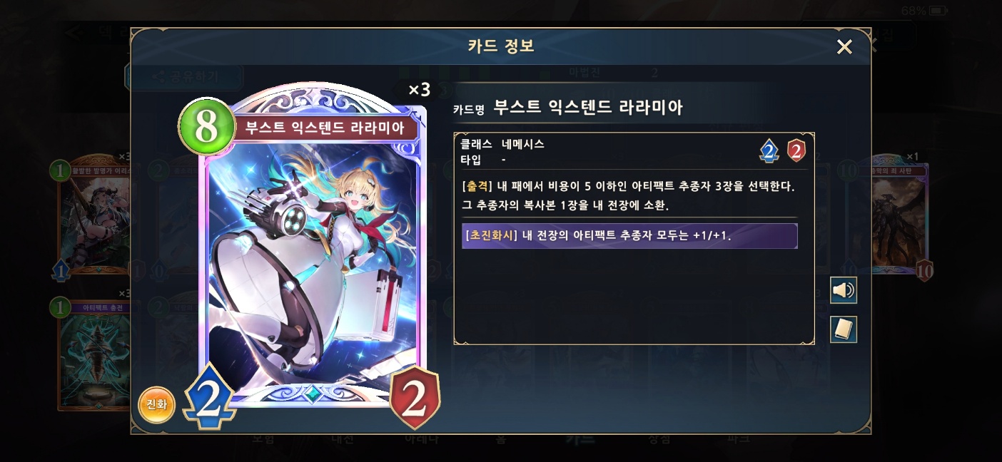 필수 레전드 카드는 단 하나 '부스트 익스텐드 라라미아'다. 대신 관련 골드 카드들은 가급적 투입하는 것이 좋다. 하나도 없이 라라미아만 세 장을 가지고 덱을 구축하는 것은 무모한 행동이다. 골드 카드 중 아티네메에서 사용하는 카드는 '결의의 소녀 미리암', 개경의 천궁 알루에트' 2종이다. 여기에 레전드 카드 '새로운 소녀 에이스'와 골드 카드 '실비아'나 '유산의 포격'은 선택사항이다.