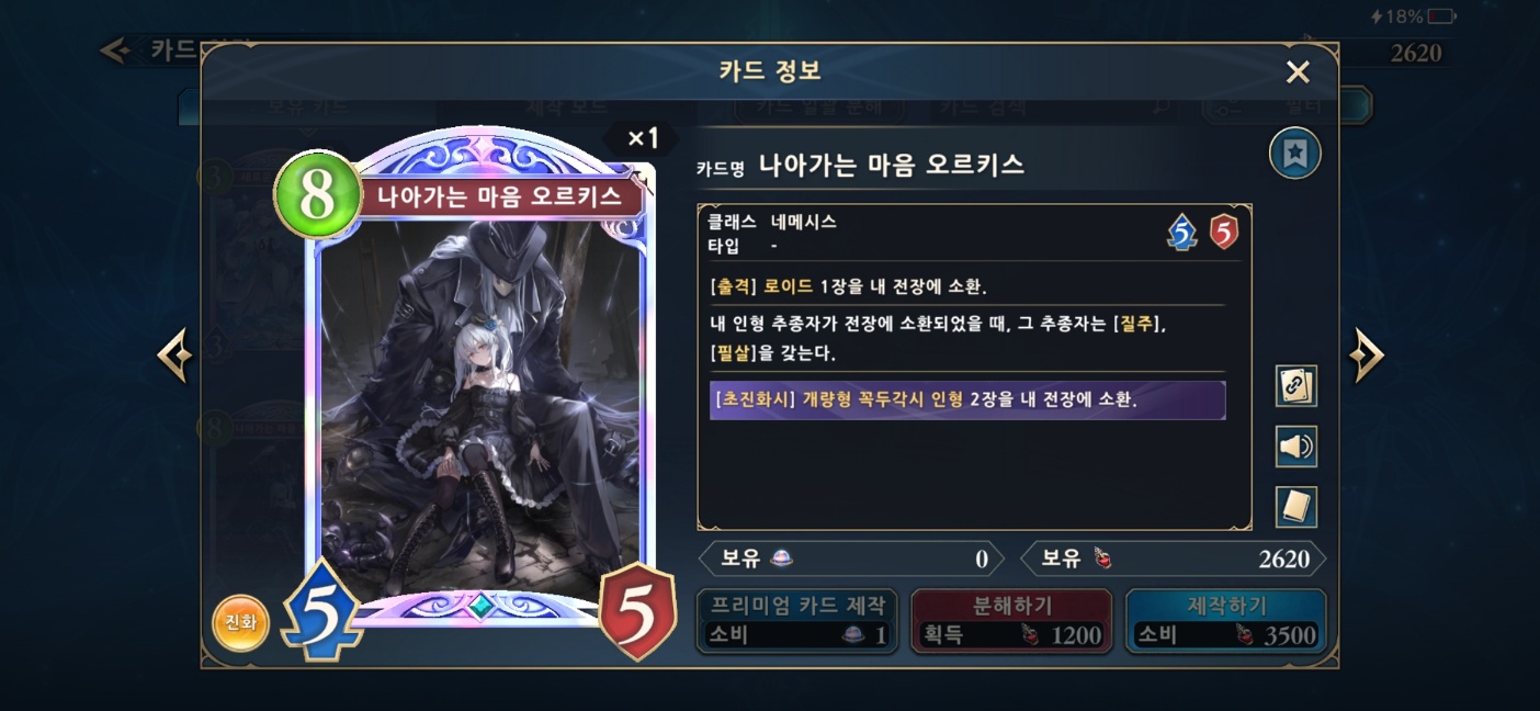 필수 레전드 카드는 '나아가는 마음 오르키스' 하나 뿐이다. 여기에 더해 사용할 수 있는 골드 카드도 '광기의 창조자 리암' 뿐이기 때문에 현재 가장 싼 덱이라고 할 수도 있다.