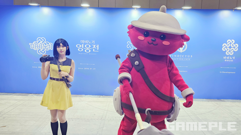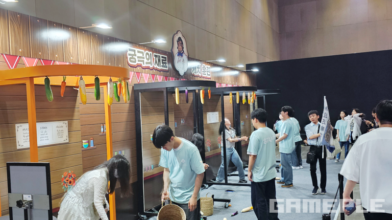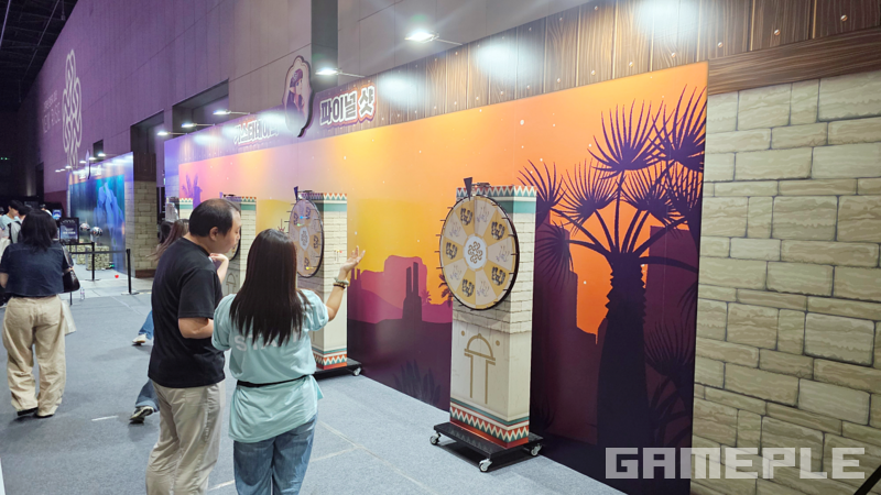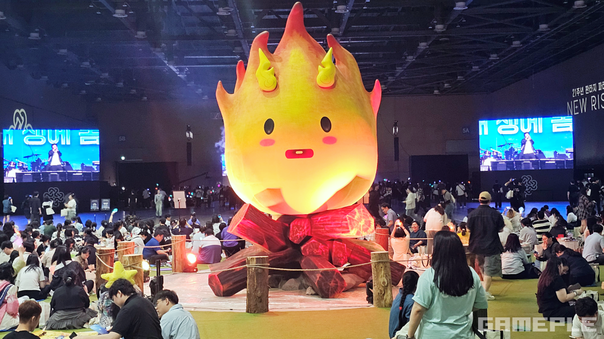 홀 한복판에는 대형 '모닥불 정령' 조형물과 통나무 목책이 자리잡았다. 가장 안쪽 메인 스테이지를 대형 스크린과 함께 감상할 수 있어 핵심 휴식 공간이 됐다. 게임 속 디자인을 본따 만든 판타지 파티 게시판으로 부스와 정보를 볼 수 있었다.