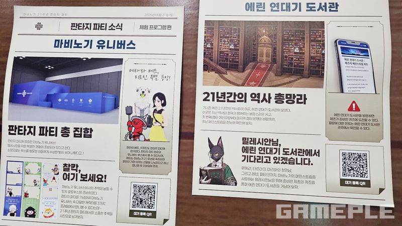 가장 인상이 깊게 남는 곳은 '에린 연대기 도서관'이었다. 비밀스러운 서고 콘셉트로 안팎을 꾸몄고, 21년간 이어진 마비노기 메인스트림의 역사를 감상할 수 있다. 불과 하루 선보이고 끝나기 아쉬울 만큼 정성 들여 전시장을 디자인했다.