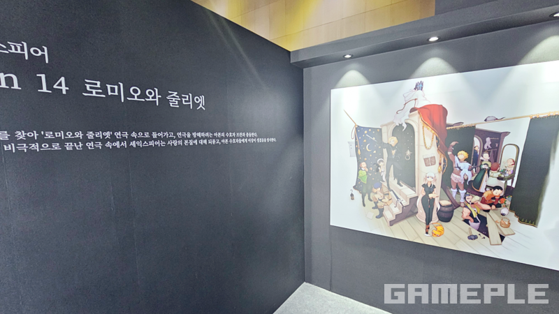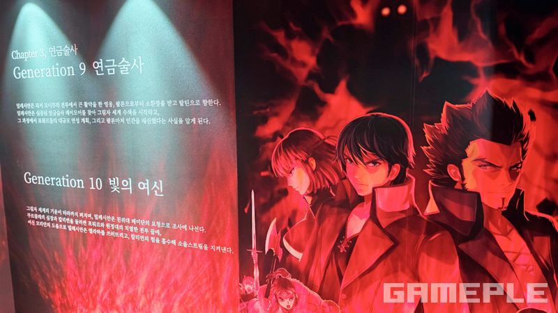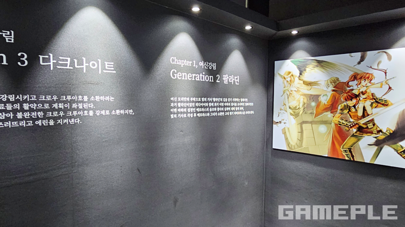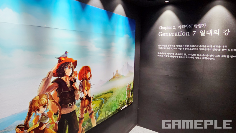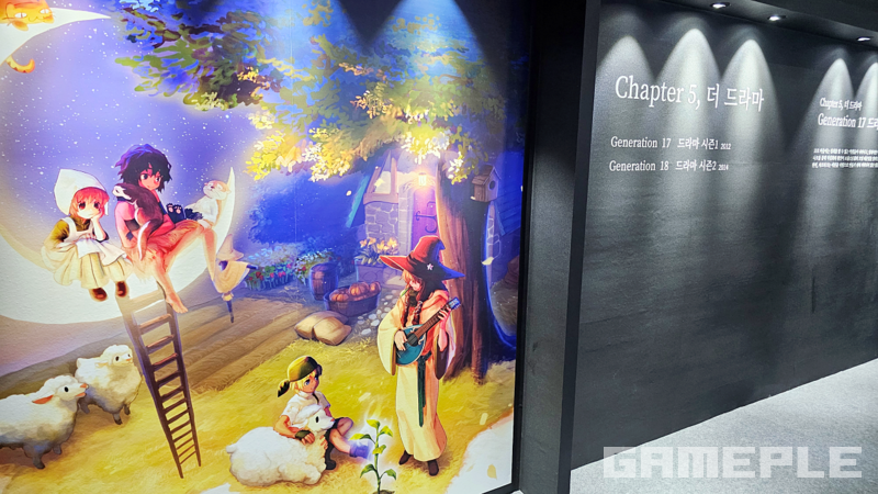 G1 '여신강림'부터 시작해 각 챕터와 제너레이션이 그림, 전시물, 포토존과 함께 이어졌다. G26 '운명의 바람'과 같은 최근 업데이트까지 각 이야기를 상징하는 것들로 꾸몄다. 과거 마비노기 개발 원화들도 한 공간에서 만날 수 있었다.