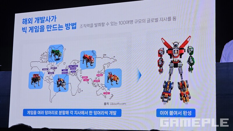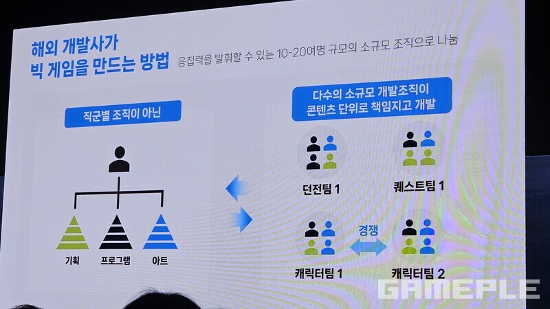 이를 채우기 위한 방법은 인력이다. 전체 투입 인원은 천명이 넘어도 여러 지사로 나누어 개발 후 이어붙이는 방법이나, 다수 소규모 개발조직이 콘텐츠 단위로 책임지고 개발하는 방법이 해외에서 사용하는 여러 방식 중 하나다.