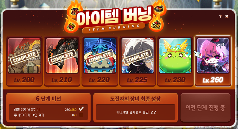 그렇다면 하드 스우를 혼자 클리어하기 위한 템세팅 기준이 중요하다. 다만, 크게 걱정할 필요는 없는 것이 6차 전직 완료 기준 ‘아이템 버닝’ 이벤트를 따라서 도전자의 장비를 성장시키기만 해도 하드스우 처치가 가능한 수준의 스펙이 나온다.