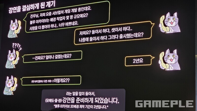 최진우 팀장은 11년차 경력을 지닌 배경 모델러다. 본인을 "계획 세우는 걸 좋아하는 배경 아티스트이자 오타쿠"로 소개했으며, 손맵(핸드 페인팅) 텍스쳐와 배경 일러스트도 함께 제작했다. 현재 블루 아카이브는 인력을 충원하면서 5명에 달하는 인원으로 3D배경을 작업 중이다.