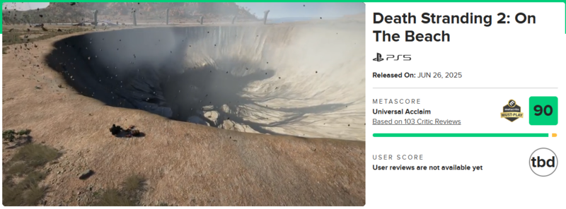 코지마 히데오 감독의 신작 ‘데스 스트랜딩2: 온 더 비치’의 메타크리틱 점수가 공개됐다. 출시를 앞둔 ‘데스 스트랜딩2’는 메타스코어 90점을 받으며 글로벌 매체 모두로부터 높은 평가를 받았다.