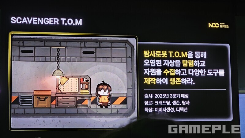 또다른 신작은 '스케빈저 톰'이다. 오염된 세계 속에서 눈을 뜬 주인공이 지상을 탐험하고 생존하는 크래프팅 탐사 게임이다. 무한한 공간을 탐험하는 경험을 주는 것이 목표다. 스틸컷을 통해 어떤 것을 수집하고 나가야 할지 의사결정을 하는 과정을 거친다. 이미지는 생성형 AI로 제작됐고, 올해 하반기 출시된다.