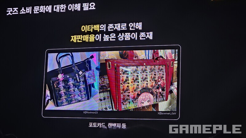 국가에 따라 굿즈 소비 방식은 다르다. 일본에서 '이타백'은 자주 볼 수 있는 가방이다. 좋아하는 캐릭터 포토카드나 캔뱃지로 꾸미고 내부에 캐릭터 인형을 넣어 들고 다니면서 현장에서 같은 팬들에게 소개하고 자랑하는 문화다.