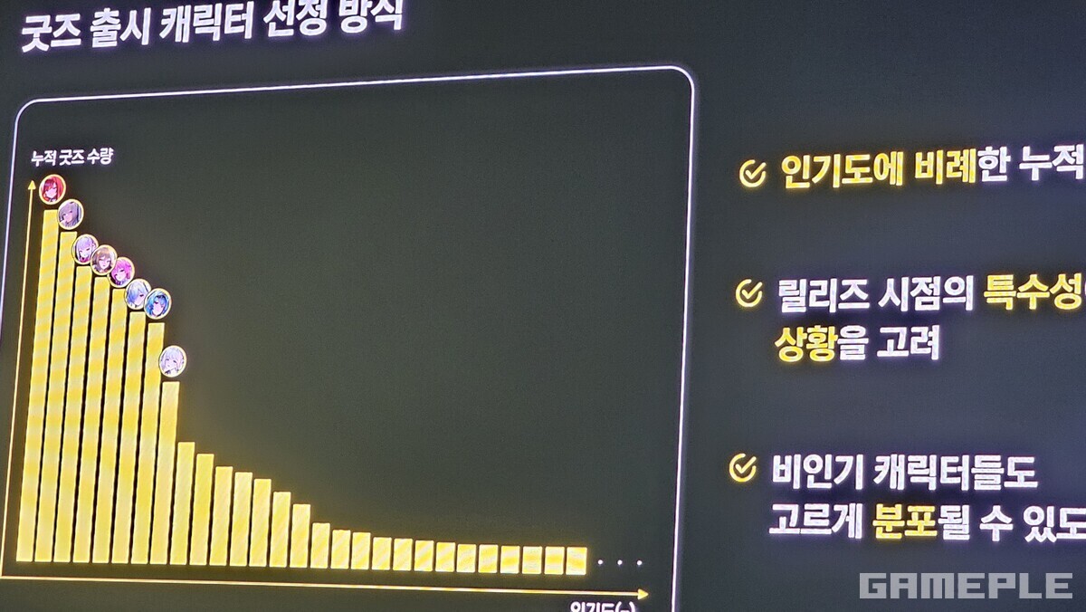 기본적으로는 수요에 따라 인기가 높은 캐릭터 생산 집중이 당연하다. 개발진이 직접 나서서 비인기 캐릭터도 최소한의 라이트 굿즈는 확보될 수 있게 노력하고 있다. 물론 무턱대고 모든 캐릭터 굿즈를 한 행사에서 다 팔 수는 없다. 어느 시점에 어떤 캐릭터 굿즈를 어떻게 판매할 것인가를 계획하는 것도 좋을 것이다.