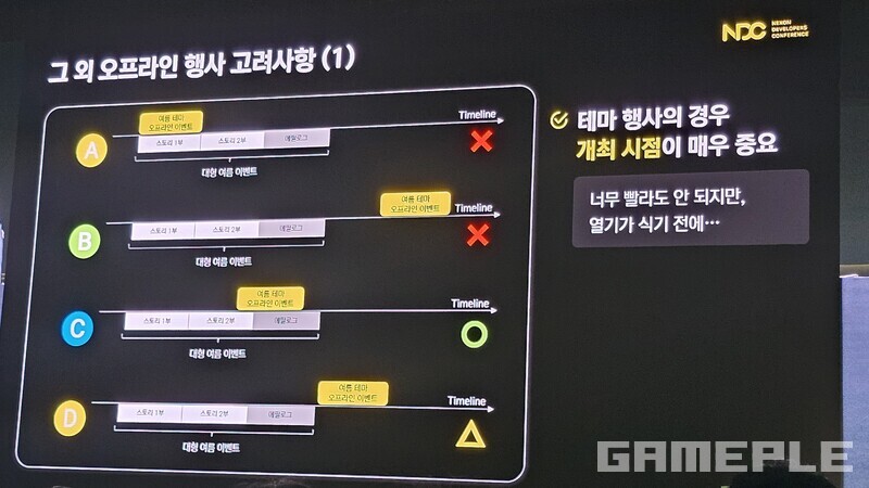 니케는 이벤트 1부와 2부가 나뉘는데, 스토리 하이라이트가 나오는 2부 후반부 시점에 행사 개최가 가장 효과적이었다. 너무 빠르거나 늦으면 아직 분위기가 올라오지 않았거나 여운이 사라지는 경우가 많다. 일정이 여의치 않으면 더 범용적인 테마를 가지고 진행하는 편이 좋았다.