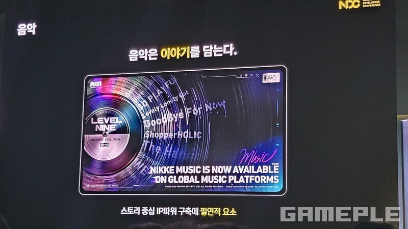 음악도 이야기를 담기 위해 매우 중요하다. '니케'는 이제 오리지널 OST만 500곡을 넘는다. '코스모그래프'의 음악 스타일이 서구권에 효과적인 마케팅이 되면서 스토리에 맞는 BGM을 살리는 효과를 가진다. 라이브 스트리밍 등 팬서비스를 가지며 진행하고 있다.